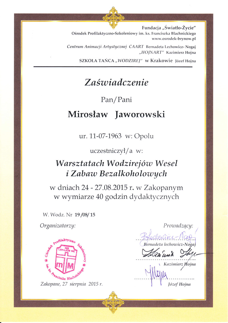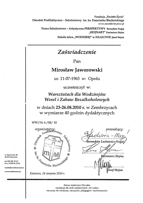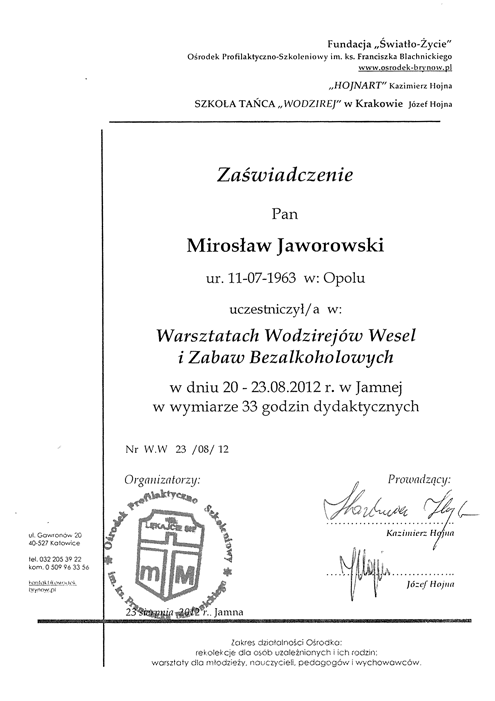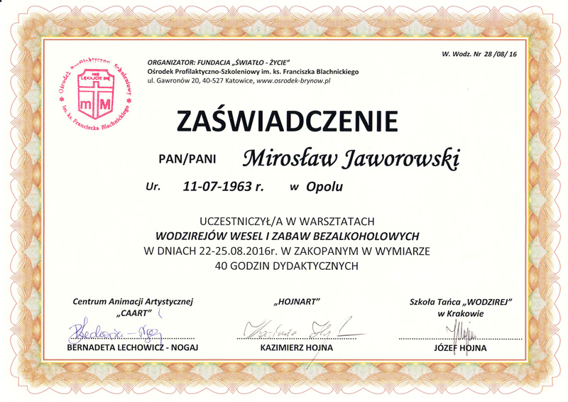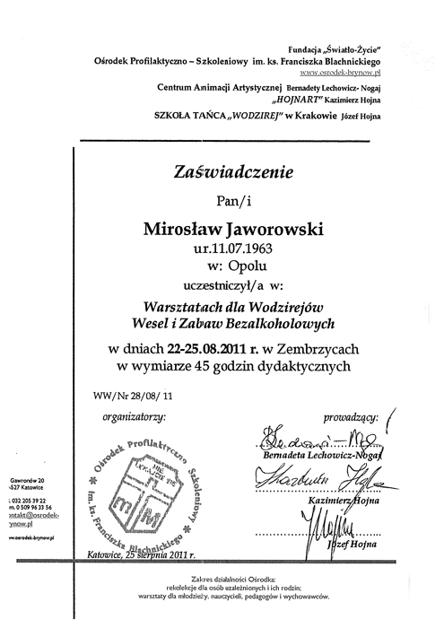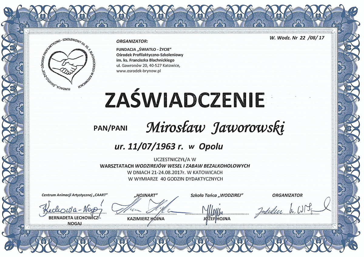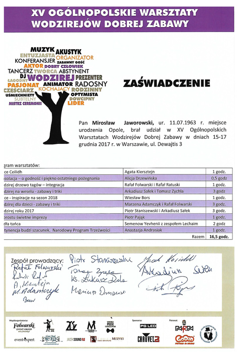 Nie przestaję się rozwijać uczestnicząc w wielu warsztatach, szkoleniach, ćwiczeniach. Współpracuję też z innymi znanymi wodzirejami.