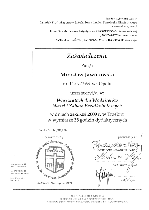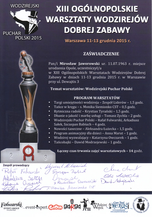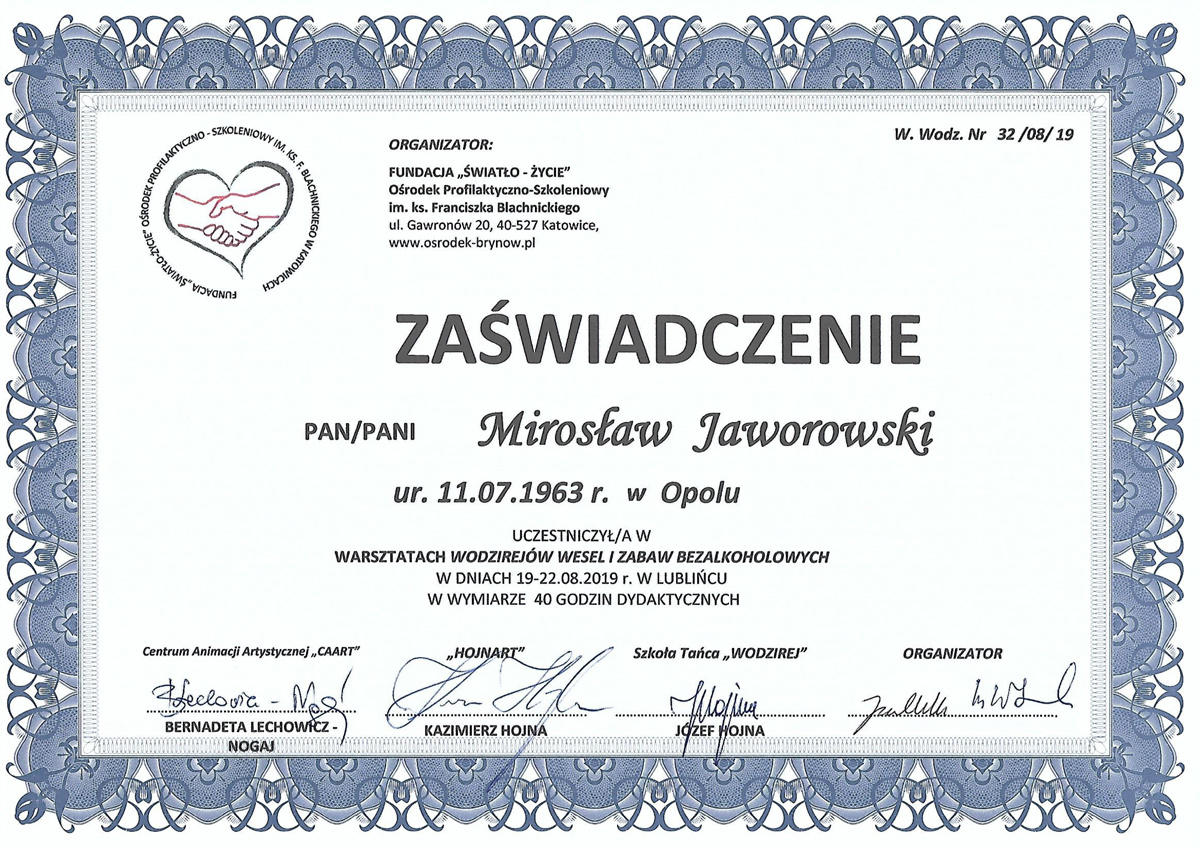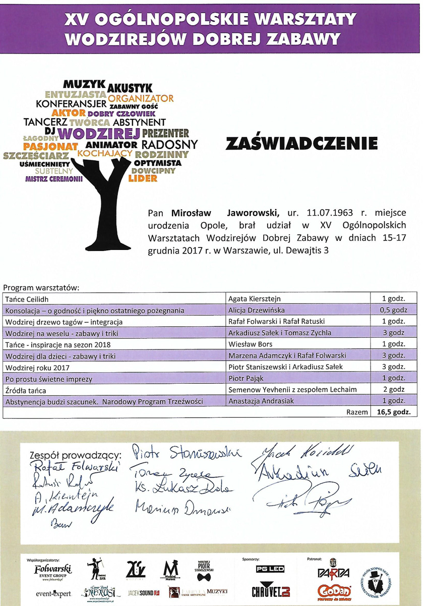 Nie przestaję się rozwijać uczestnicząc w wielu warsztatach, szkoleniach, ćwiczeniach. Współpracuję też z innymi znanymi wodzirejami.