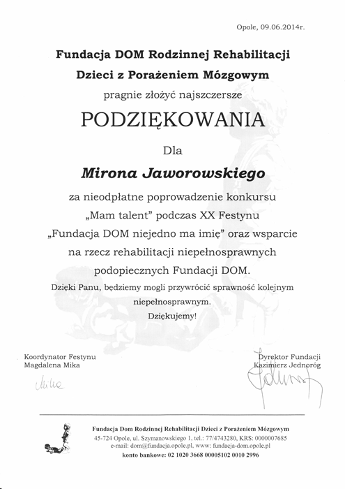 Rzadko można spotkać osobę potrafiącą w sposób kulturalny i zabawny prowadzić zabawę w trakcie różnych uroczystości jubileuszowych (urodziny, rocznice...). Kimś takim jest Mirosław Jaworowski. Sama niedawno brałam udział w imprezie prowadzonej przez niego. Świetna zabawa, inteligentny humor, niebanalne konkursy, dobra muzyka i śpiew. Naprawdę warto!!! ?