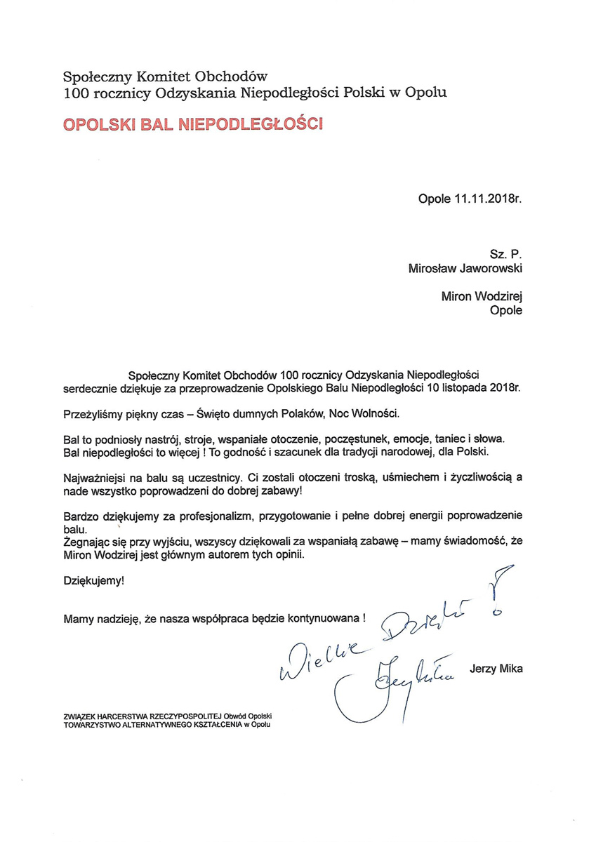 "Prowadzenie imprezy w wykonaniu wodzireja Mirona jest pełne profesjonalizmu i zachęty do dobrej zabawy. Ogromnym atutem jest podążanie za potrzebami i oczekiwaniami osób uczestniczących w imprezie. Proponowana muzyka porywa do tańca, a organizowane zabawy są pełne dobrego smaku. Dotychczas nie byłam na imprezie podczas, której wszyscy goście byli na parkiecie. Imprezy z wodzirejem Mironem mogłyby trwać do białego rana🙂" Pozdrawiam serdecznie wraz z gośćmi uczestniczącymi w imprezie urodzinowej
